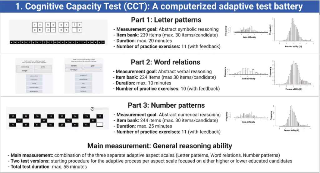 Notre psychologue de recherche a discuté de l’utilisation des tests d’intelligence adaptative dans le cadre du recrutement et de la sélection. Ce test est passé à domicile par les candidats d’une grande organisation gouvernementale aux Pays-Bas et se compose de trois parties : Modèles de lettres, Relations entre les mots et Modèles de nombres. Les recherches indiquent que le test a une bonne fiabilité et une bonne validité. Plusieurs précautions ont également été prises dans le test afin d’éviter les fraudes de la part des candidats (lorsqu’ils passent le test à domicile).