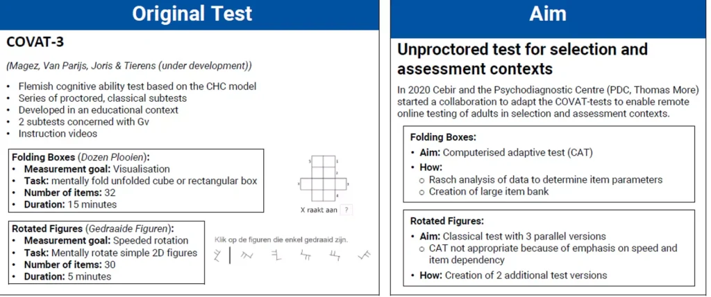 Sophie, psychologue de recherche, a expliqué le développement du COVAT Space OL, un test sur le traitement de l’information visuelle. Ce test a été développé en collaboration avec le Centre de Psychodiagnostic (PDC) de Thomas More. Le test se compose de deux parties : Visualisation (partie pliage de boîtes) et Rotation rapide (partie figures torsadées). Il s’agit d’un test de raisonnement qui peut être utilisé pour des tests à domicile dans le cadre d’une procédure de sélection.
