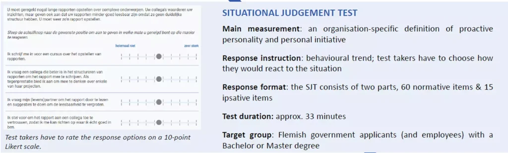 Evalyne, psychologue de recherche, a parlé du processus de développement d’une nouvelle tâche de jugement situationnel (Situational Judgment Task – SJT) spécifiquement destinée à une grande organisation gouvernementale belge. Dans ce SJT, les concepts de “personnalité proactive” et de “sens de l’initiative personnelle” sont mesurés afin de mieux estimer l’employabilité d’une personne. Pour ce faire, notre département de recherche s’est entretenu avec un grand nombre d’experts au sein même de l’organisation et a mené une étude de validité approfondie sur un échantillon de plus de 300 candidats issus du groupe cible du test.